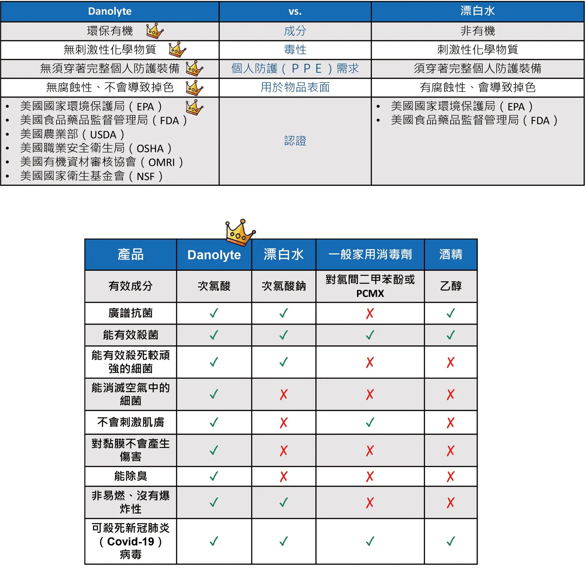 Danolyte達諾萊和漂白水/其他除菌液比較圖